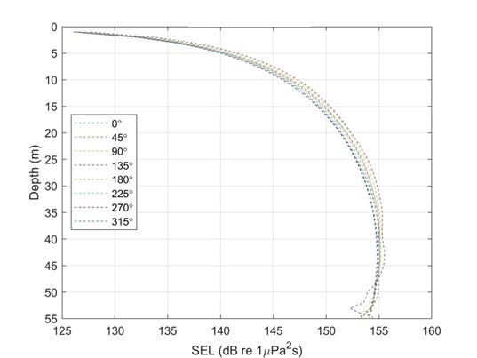 模擬點位750m處聲曝值範例 模擬點位一半水深處聲曝值分布圖範例