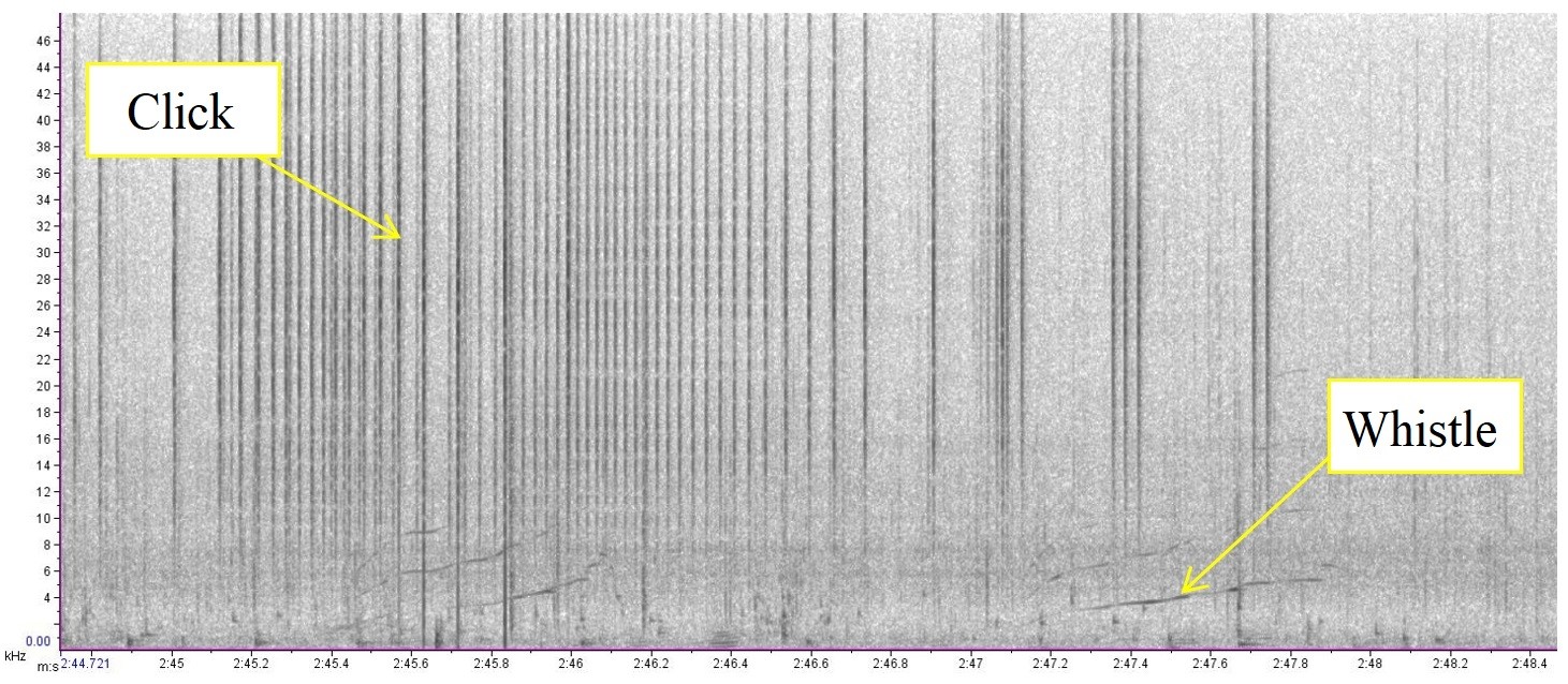 Using acoustic instrument to monitoring the specific whistling and clicking sounds of cetaceans, using software to detect and manually identifying them to understand the activities of cetacean in the relevant area and to serve as a reference for ecological conservation.