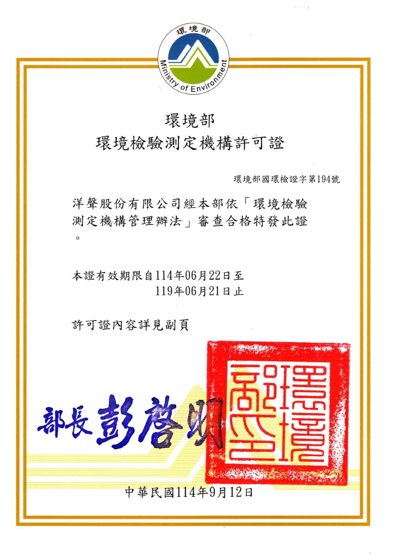 本公司申請環境部環境檢驗測定機構許可證展延審查已獲通過。