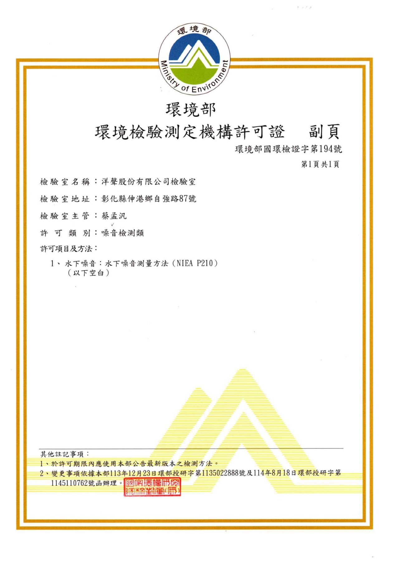 依據環境部中華民國114年9月12日 環部授研字第11450106080號函,許可證效期自114年6月22日起至119年6月21日止,項目類別為噪音檢測類-水下噪音 (詳如證書副頁所示),歡迎舊雨新知多加利用。